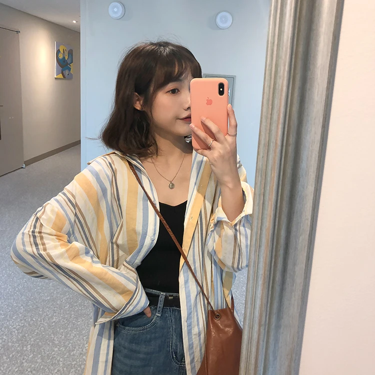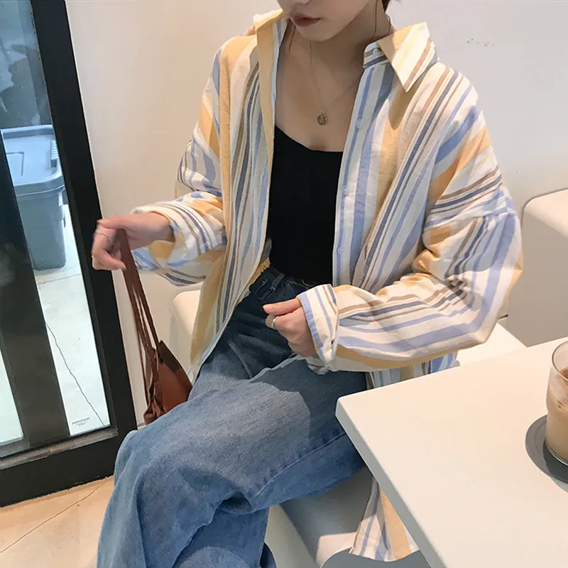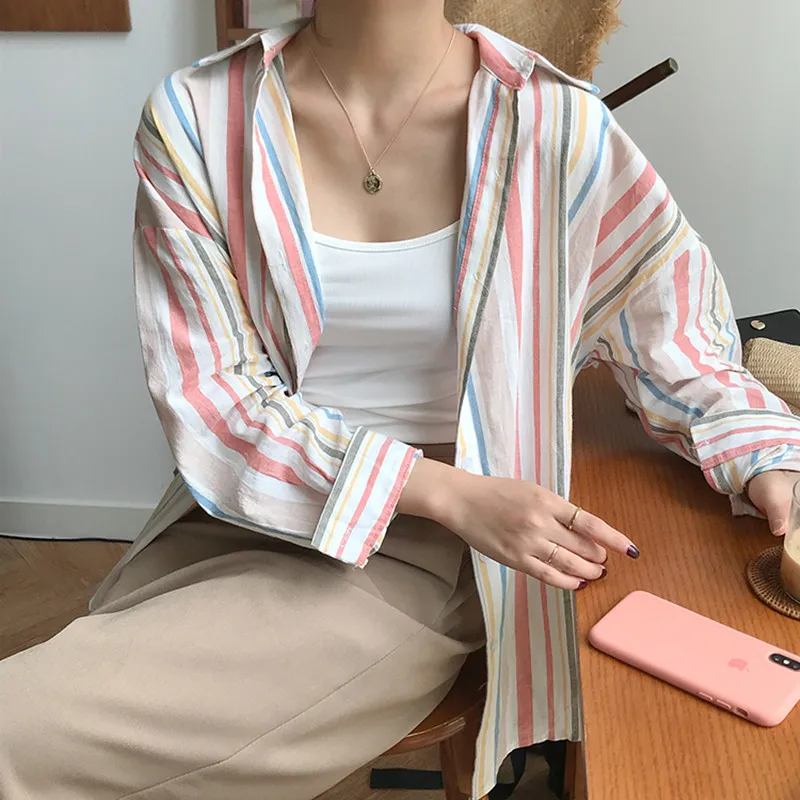 2 colors 2019 autumn korean style long-sleeve colorful stripe shirt casual loose blouses womens top